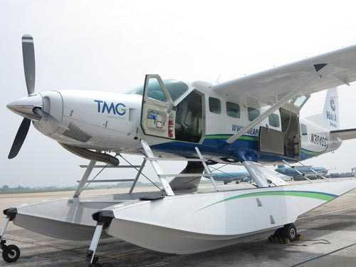 Thủy phi cơ Cessna Grand Caravan 208B – EX là máy bay đời mới nhất của Mỹ, đã thực hiện chặng bay 15.000 km từ Mỹ về Việt Nam, được chào đón theo nghi thức phun nước. (Ảnh: Zing)