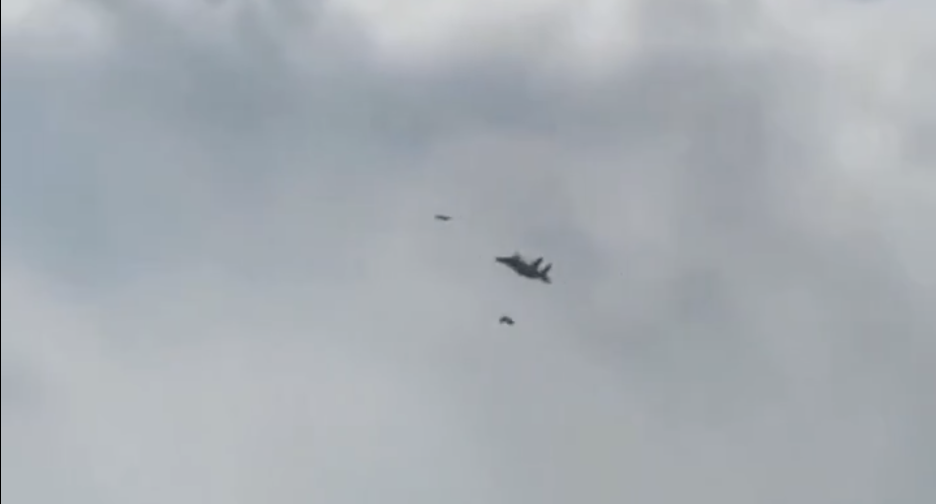 Theo các tài khoản chia sẻ video trên X, tiêm kích F-15 của Mỹ rượt đuổi ít nhất hai máy bay không người lái (UAV) Shahed-136 trị giá 20.000 USD của Iran, nhưng không thành công.