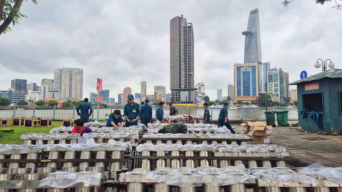 Ghi nhận của PV Báo Điện tử VTC News, sáng 2/9 tại khu vực đầu hầm vượt sông Sài Gòn (phường An Khánh) – một trong những điểm bắn pháo hoa tầm cao, hàng nghìn giàn pháo được lực lượng thi công khẩn trương lắp đặt.
