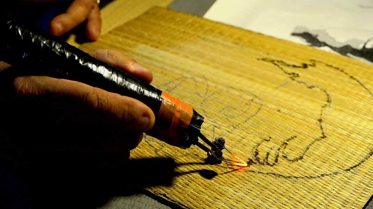 Hơn 5 năm qua, họa sĩ Võ Minh Mẫn, 75 tuổi (Châu Đốc, An Giang) vẽ tranh bằng kỹ thuật đốt nóng trên chất liệu chiếu Uzu, đến nay ông có hơn 30 tác phẩm.