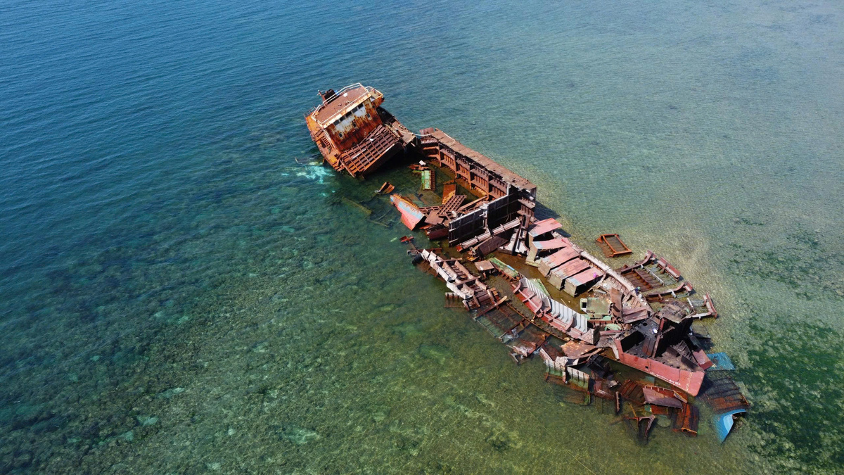 Tàu mắc cạn cách bờ khoảng 400 m, nằm trong vùng bãi rạn nhiều đá ngầm, thân tàu đã bị ăn mòn, hoen gỉ nặng.