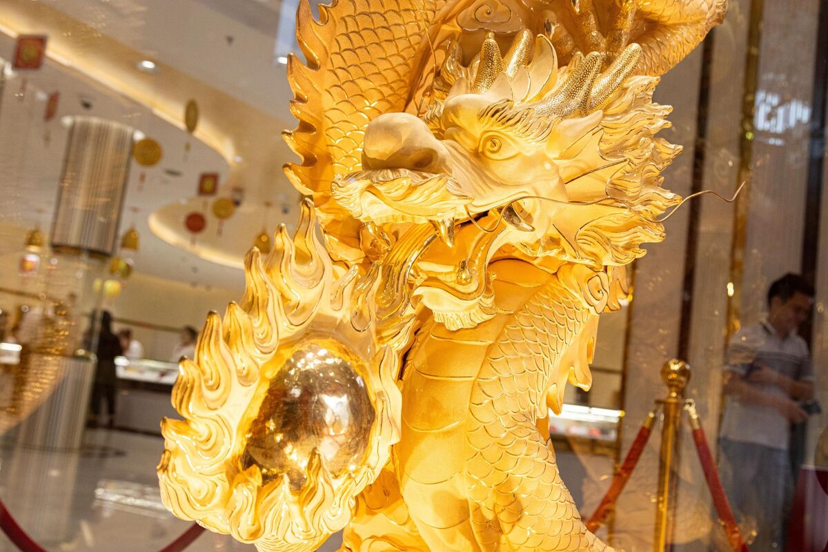 Tượng rồng vàng "Đại long nhả ngọc" được phủ hoàn toàn bằng vàng 9999, có chiều cao 3,1 mét, tạo sự choáng ngợp với nhiều khách hàng. Dưới chân của bức tượng có một quả cầu màu vàng, tượng trưng tài lộc mà rồng đưa đến cho người dân.