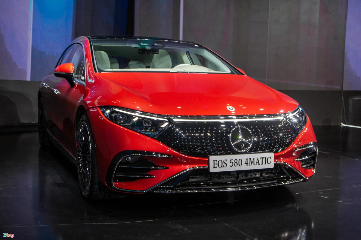 Chiếc EQS 580 4MATIC được trưng bày sở hữu màu sơn đỏ ở ngoại thất, trong khi chiếc EQS 450 thấp hơn có ngoại thất màu xanh dương.