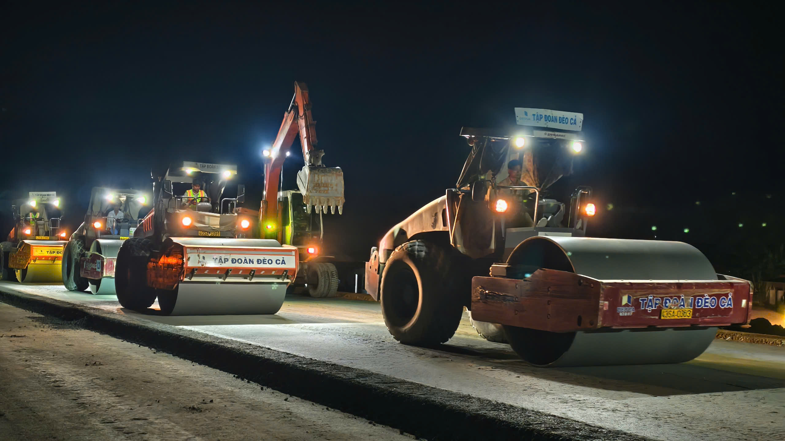 Công nhân thi công xuyên đêm trên tuyến cao tốc Quảng Ngãi - Hoài Nhơn, chạy đua với thời gian để đưa dự án hoàn thành.