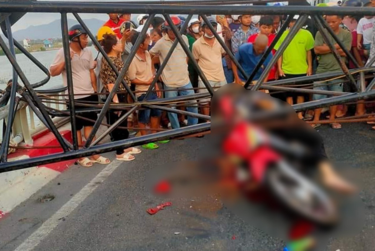 Tại hiện trường, điểm giữa cần cẩu bị đổ nằm chắn lên mép thành cầu Cửa Lấp và chiếc xe máy, đè lên ngang người nạn nhân.