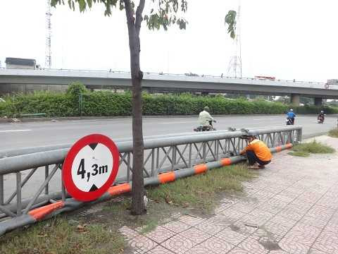 Nhận được tin báo, lực lượng CSGT, cơ quan chức năng quận 12 đã có mặt tại hiện trường để điều tra xử lý vụ xe đầu kéo tông sập bảng hạn chế chiều cao.