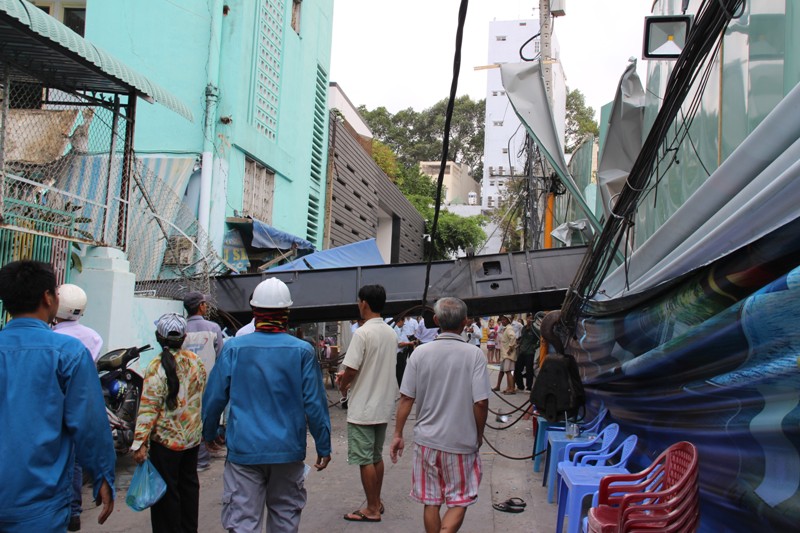 “Lúc đó nhiều người đang đi lại bình thường thì chiếc cần cẩu bất ngờ rơi xuống. Nó phát ra tiếng kêu to như bom nổ đè lên nhiều nhà dân, ngói bắn tung tóe khắp nơi khiến ai cũng hoảng loạn tháo chạy”, bà Nga, một người dân sống trong hẻm 378 kể lại.