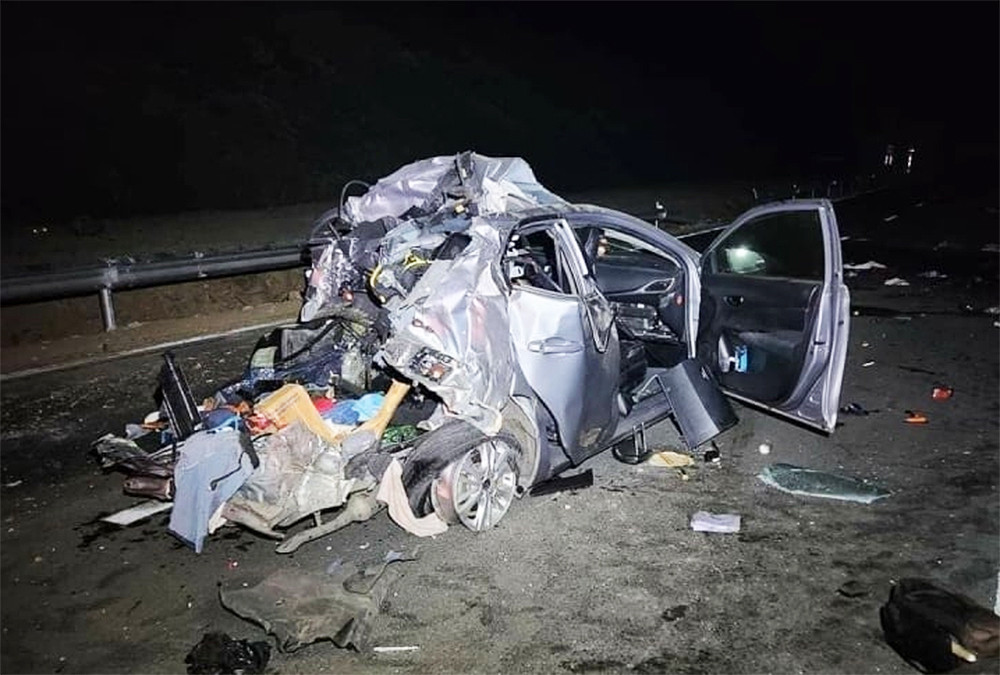 Chiếc ô tô 4 chỗ bẹp dúm trong vụ tai nạn làm 4 người thương vong trên cao tốc Nha Trang - Cam Lâm ngày 24/6/2023. (Ảnh: TX)