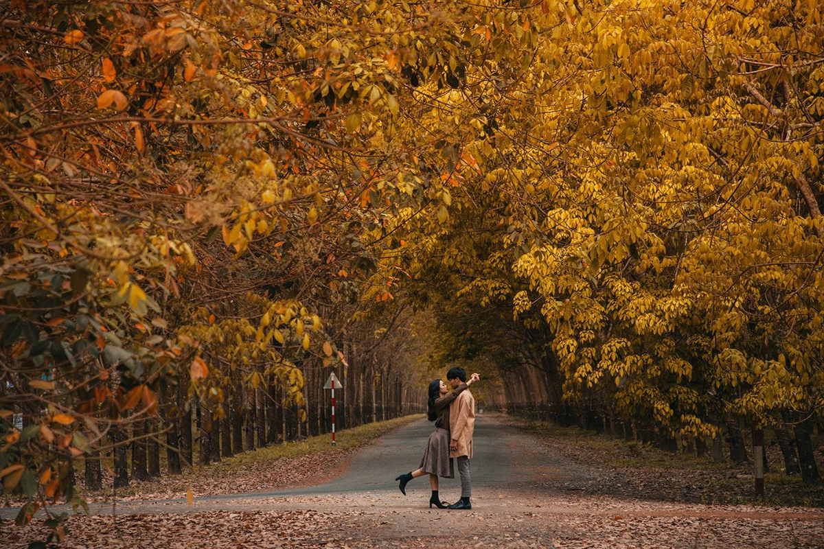 Địa điểm này không ở đâu xa, mà ở ngay tỉnh Bình Dương. Khoảng cuối tháng 12 cho đến tháng 3 hàng năm, Bình Dương lại có một mùa lá vàng rơi, đó là mùa của những cánh rừng cao su thay lá đồng loạt. Thời điểm lý tưởng nhất để du khách “săn ảnh” là trong khoảng thời gian tháng 1, tháng 2 bởi lúc này lá còn nhiều và khung cảnh cũng thơ mộng hơn bao giờ hết.