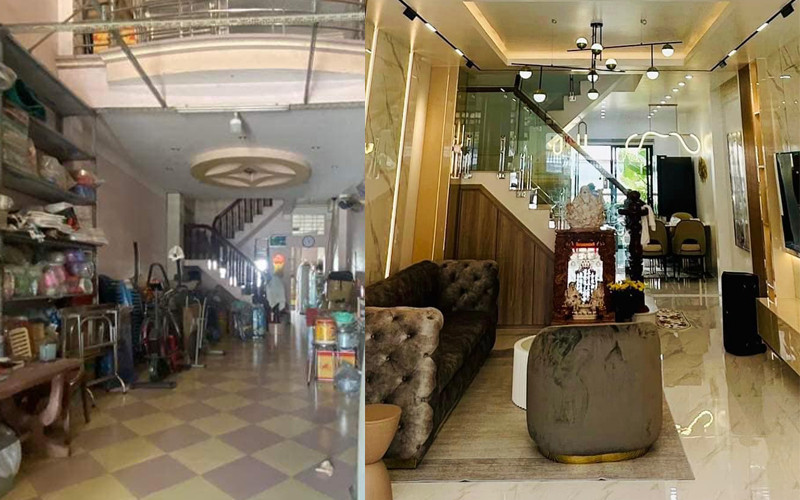 Khi bước từ cửa vào, bạn sẽ thấy sự khác biệt trước và sau khi cải tạo ngôi nhà (hình bên trái là ngôi nhà khi chưa sửa sang)
