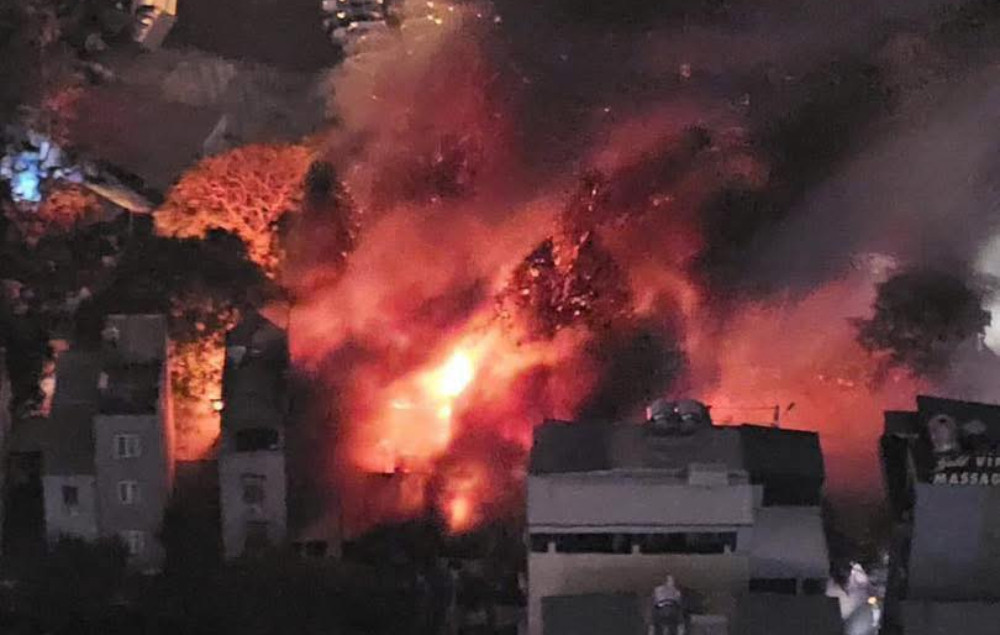 Hiện trường vụ cháy gần toà nhà chung cư. Vụ hoả hoạn tạo thành quầng lửa và khói bao trùm khu vực.