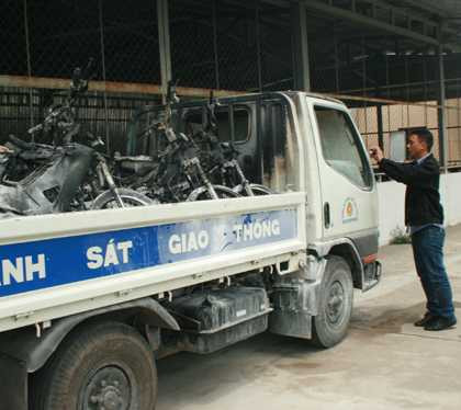 Công an huyện Phong Điền cũng chuyển đến hiện trường 8 bình CO2 rồi cùng với người dân chữa cháy. Hơn 7 phút sau, lửa được khống chế nhưng 3 xe máy bị cháy trơ khung. Một phần cabin xe đặc chủng bị cháy.Xe máy vi phạm cháy rụi trên đường trở về kho ở Cần Thơ. Ảnh: Diễm Hằng.