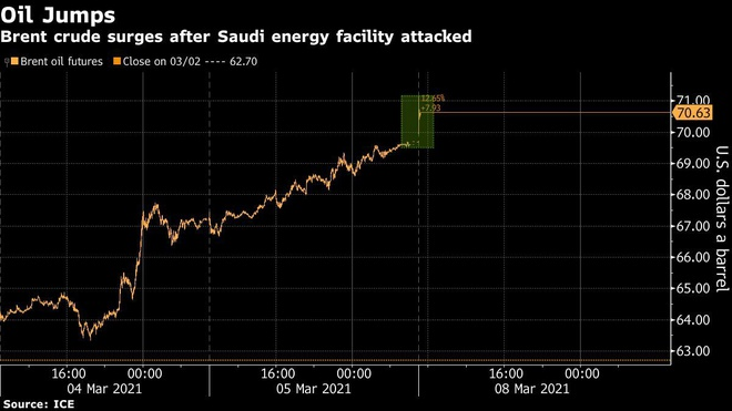 Theo Financial Times, giá dầu Brent tăng 2,9% lên 71,38 USD/thùng tại châu Á trong phiên giao dịch 8/3. Giá dầu WTI cũng tăng 2,9% lên 67,98 USD/thùng. Đây là lần đầu tiên sau 14 tháng, giá dầu vượt mốc 70 USD/thùng.