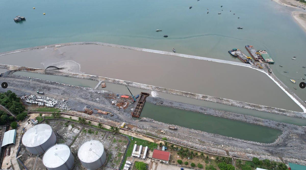 Theo ghi nhận, sau 6 tháng thi công, đơn vị nhà thầu cơ bản đã hoàn thành nhiều hạng mục phụ trợ như: trạm cân xe, bến tạm, bãi tập kết vật tư, văn phòng điều hành, nạo vét hạng mục móng đê kè đến hiện trường. Các hạng mục giao thông chính, bờ bao chứa nạo vét đã đạt 40% tiến độ thi công tổng chiều dài móng, nền, mặt đường, kè chắn sóng…