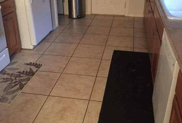 Thoạt nhìn vào bức ảnh, khó có thể nhận thấy sự hiện diện của chú chó trong căn bếp nhưng nếu tinh ý, bạn có thể nhận ra nó đang nằm trên tấm thảm.