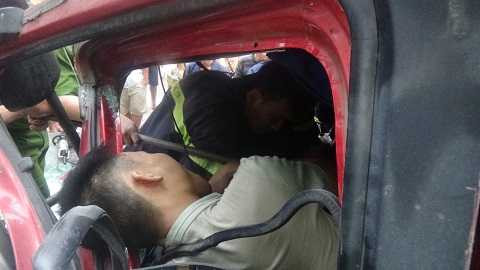 | Tài xế Hoàng bị thương và mắc kẹt trong cabin |