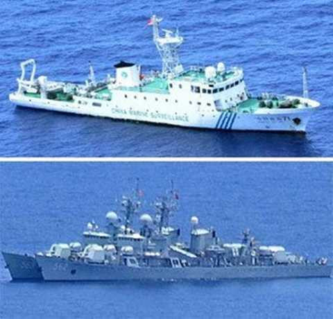 | Hình ảnh cho thấy sự hiện diện của một tàu hải giám (trên) và hai tàu khu trục nhỏ của Trung Quốc ở quanh Bãi Cỏ Mây |