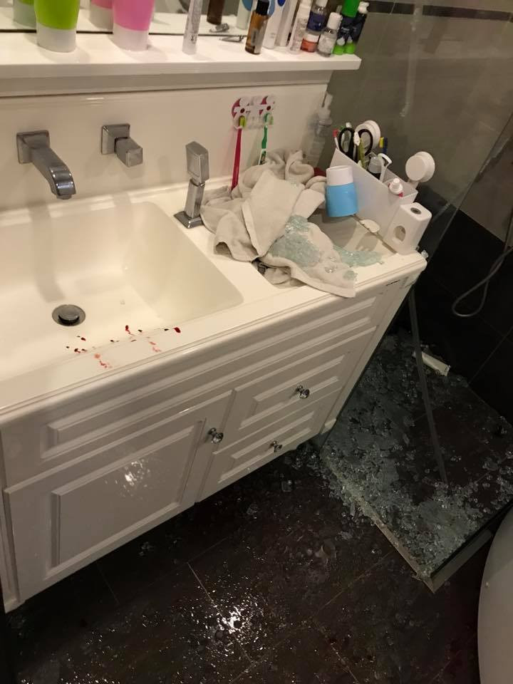 Kính cường lực trong phòng tắm nổ tung.