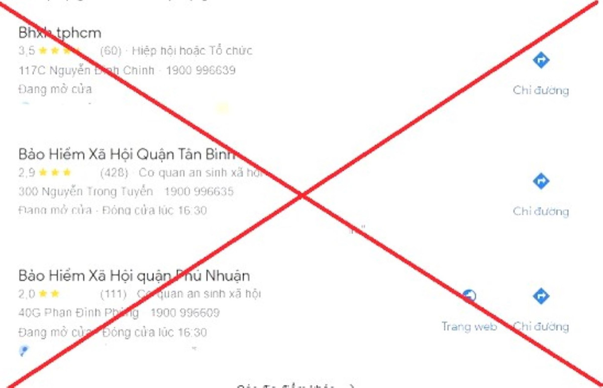Hiện nay, ngành BHXH Việt Nam chỉ có 1 số Tổng đài tư vấn và chăm sóc khách hàng là: 1900.9068 với giá cước 1.000 đồng/phút (cước phí này được trả cho nhà mạng cung cấp dịch vụ tổng đài). Tuy nhiên, qua rà soát, BHXH TP.HCM phát hiện trên trang Google Map (https://www.google.com/maps) khi tìm kiếm BHXH TP.HCM và BHXH của các quận, huyện thì phần liên hệ đã bị sửa thành các số điện thoại có dạng 1900.9966.xx. Các đầu số này có mức cước phí 8.000 đồng/phút.