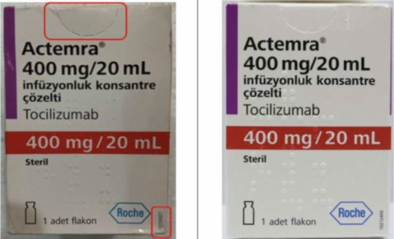 Mẫu sản phẩm nghi ngờ là thuốc giả do khách hàng cung cấp (được mua từ website: https://alomuathuoc.vn/san-pham/thuoc-actemra-400mg-20ml-gia/), được Công ty F. Hoffmann-La Roche Ltd so sánh, đối chiếu và xác nhận có dấu hiệu khác biệt so với mẫu lô thuốc ActemraÒ 400 mg/20 mL, số lô B2101B32 do Công ty F. Hoffmann-La Roche Ltd phân phối và chỉ lưu hành tại Thổ Nhĩ Kỳ.