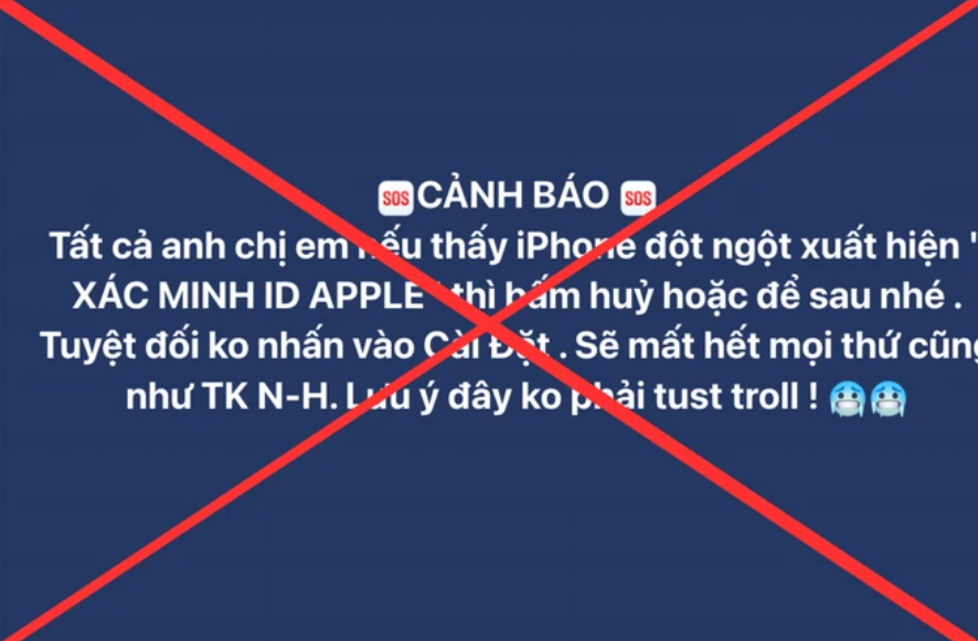 Nhiều tài khoản mạng xã hội còn đăng bài với nội dung: "Góc cảnh báo: Mọi người xài iPhone đột nhiên màn hình hiện lên ‘Xác minh ID Apple’ thì bấm Hủy hoặc Để sau nhé. Apple ID lạ đừng nhấn cài đặt, đang có chiêu hack iPhone."