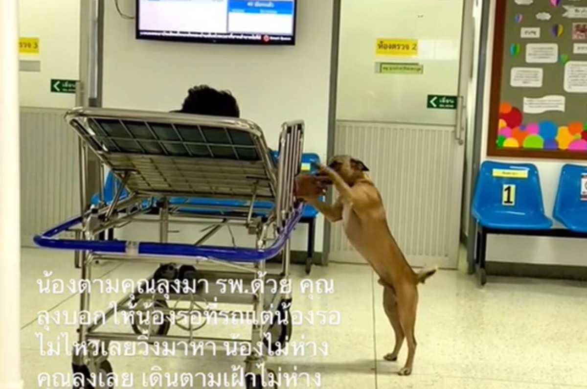 Hình ảnh được ghi lại tại bệnh viện tỉnh Rayong, Thái Lan cho thấy một bức tranh đầy ấm áp giữa con vật nuôi và người chủ của nó. Chú chó thể hiện một bộ dạng lo lắng khi không ngừng vẫy đuôi, nhảy lên nhảy xuống chiếc băng ca để với tới chủ nhân, liếm tay người đàn ông đang nằm trên đó, tiếng kêu khe khẽ phát ra từ con vật như để hỏi han.