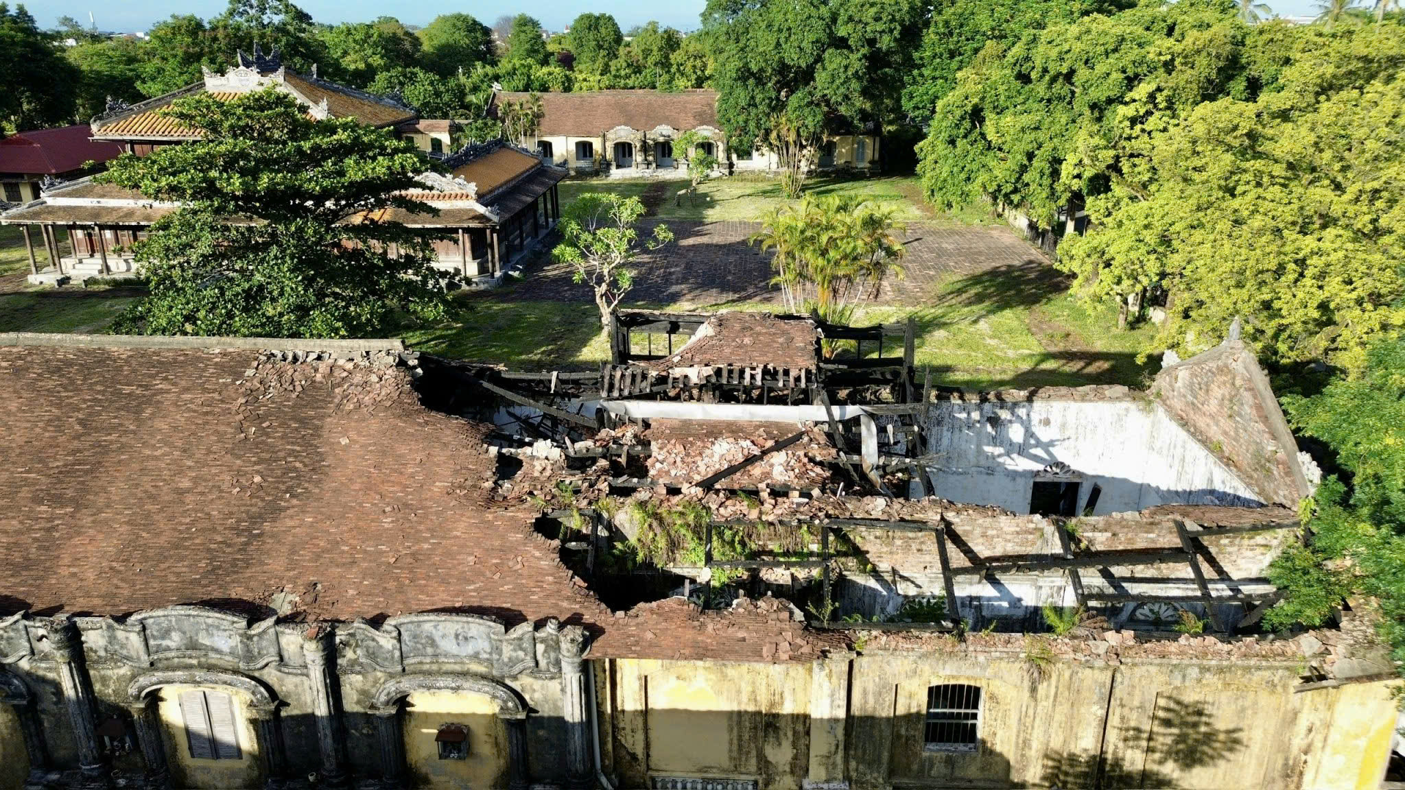 Trải qua gần 120 năm với nhiều biến động lịch sử, thiên tai, đặc biệt là trận hoả hoạn xảy ra vào tháng 8/2022 khiến Quốc Tử Giám triều Nguyễn xuống cấp nghiêm trọng. Từ trên cao nhìn xuống không khó để thấy những mái của các công trình trong Quốc Tử Giám đổ sập, xuống cấp.