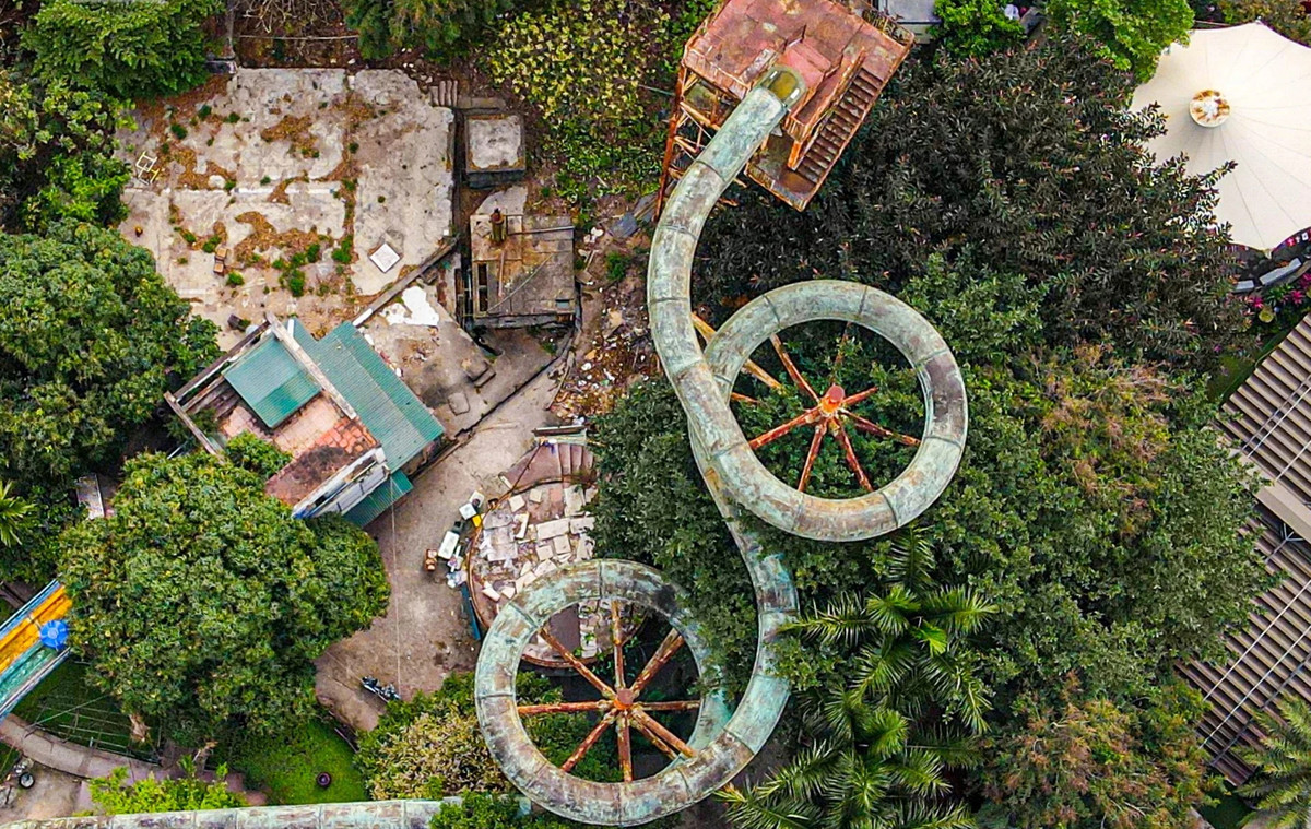 Hệ thống cầu trượt nước bằng nhựa với chân đỡ bằng sắt cũng đã cũ nát sau hàng chục năm không được duy tu bảo trì.