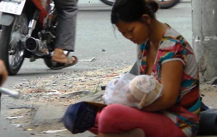 | Hình ảnh người phụ nữ bế con nhỏ ăn xin bên lề đường Lê Đại Hành (Q.11) |