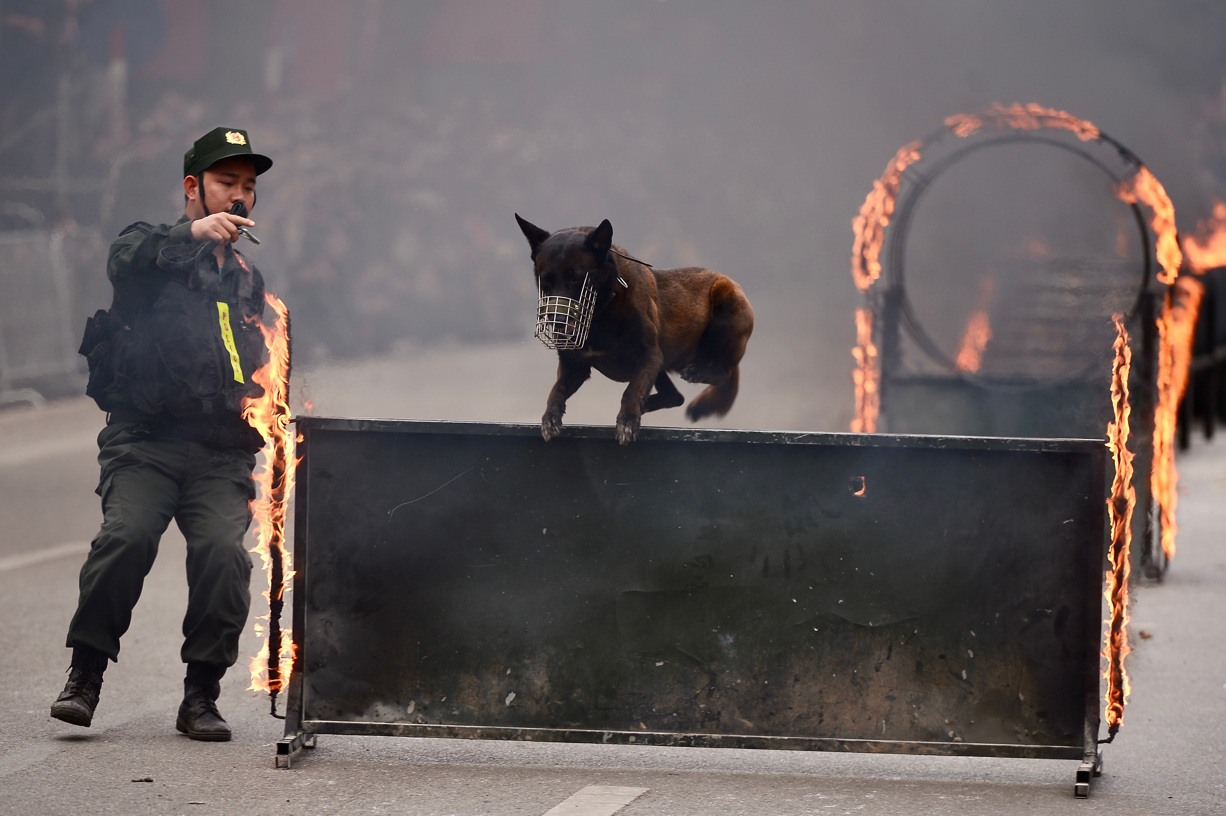 Cảnh khuyển cùng huấn luyện viên thực hiện màn nhảy qua các chướng ngại vật lửa.