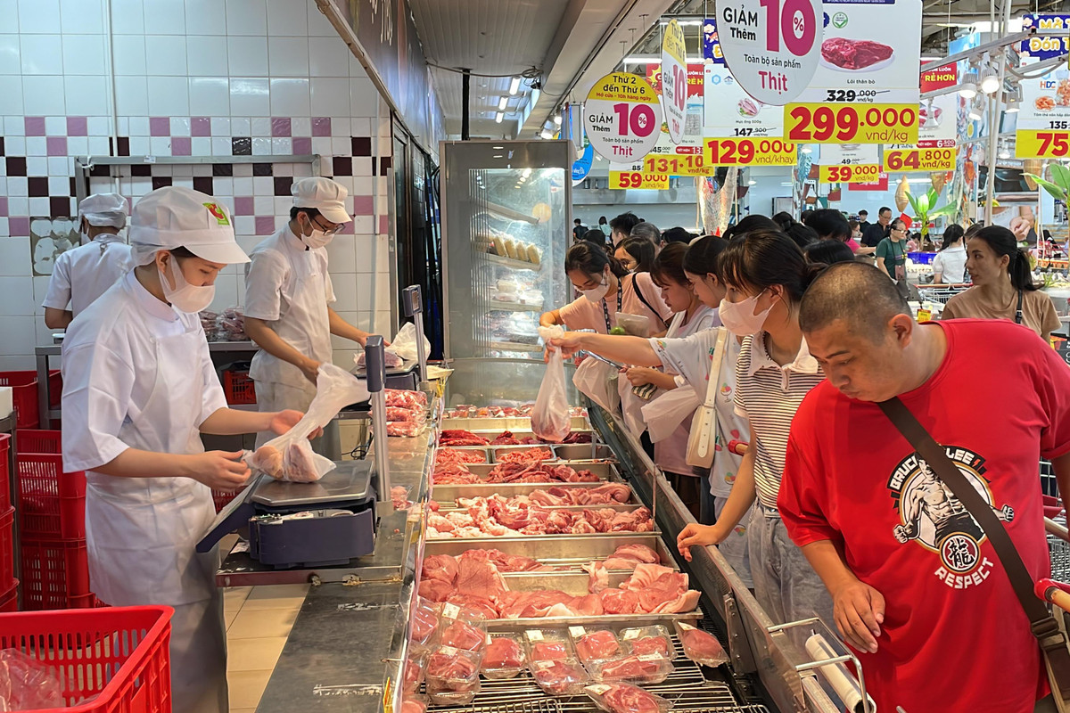 Quầy thịt cũng chật ních người đến mua sắm, tuy nhiên giá được giữ bình ổn như ngày thường. Cụ thể thịt heo ba chỉ loại ngon đồng giá 130.000 đồng/kg, nạc vai 140.000 đồng/kg, cá chép 60.000 đồng/kg, cá trắm đen 100.000 đồng/kg.