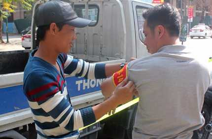 | Trước khi làm nhiệm vụ, hai cảnh sát hình sự chỉnh trang băng hiệu và... |