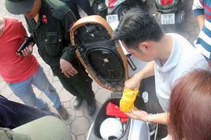 | Thiếu tá Vinh kiểm tra trong cốp xe Honda Wave phát hiện hai dao nhọn. |