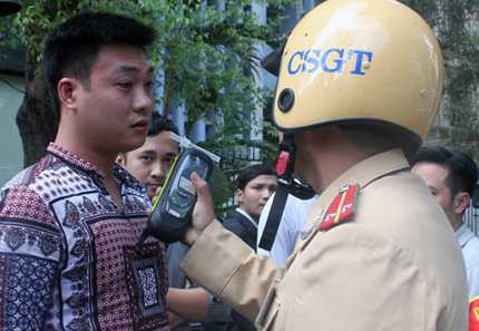 | Tổ công tác kiểm tra nồng độ cồn với người vi phạm giao thông. |