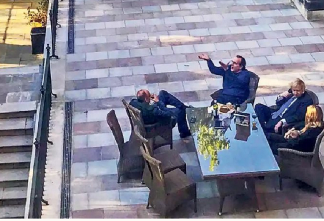Vợ chồng Thủ tướng Boris Johnson và các nhân viên tụ tập trong khuôn viên Phố Downing hồi tháng 5/2020. (Ảnh: Guardian)