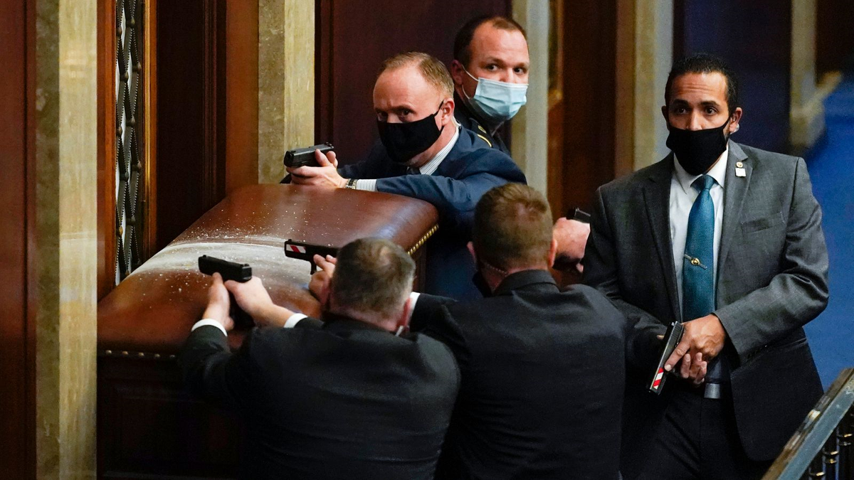 Hình ảnh được nhiều trang tin của Mỹ đăng tải cho thấy cảnh sát Mỹ cầm súng đứng gần một cánh cửa có rào chắn khi đám đông biểu tình cố gắng đột nhập vào bên trong văn phòng Hạ viện. Một người biểu tình thậm chí còn ngồi vào ghế của Chủ tịch Hạ viện.