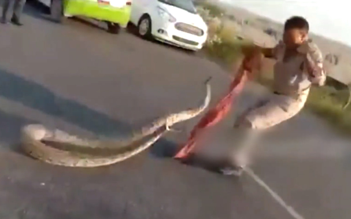 Nam cảnh sát ở Ấn Độ dùng tay không để giải cứu con trăn gấm dài gần 4m, tuy nhiên người này đã bị con vật chồm lên tấn công khiến những người có mặt hoảng sợ.
