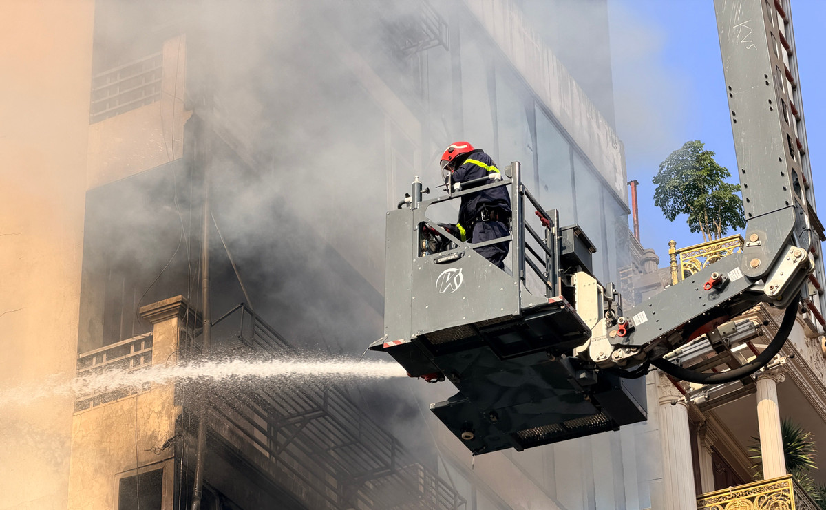 Lực lượng cứu hộ phải phá các ô cửa kính, phá tầng tum để phun nước vào bên trong.