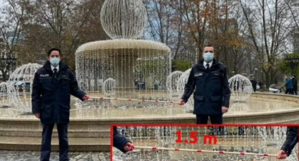 Trong đoạn video, cảnh sát Đức dùng thước gập để đảm bảo mọi người trong đám đông ở Hamburg đứng cách nhau tối thiểu 1,5 m.