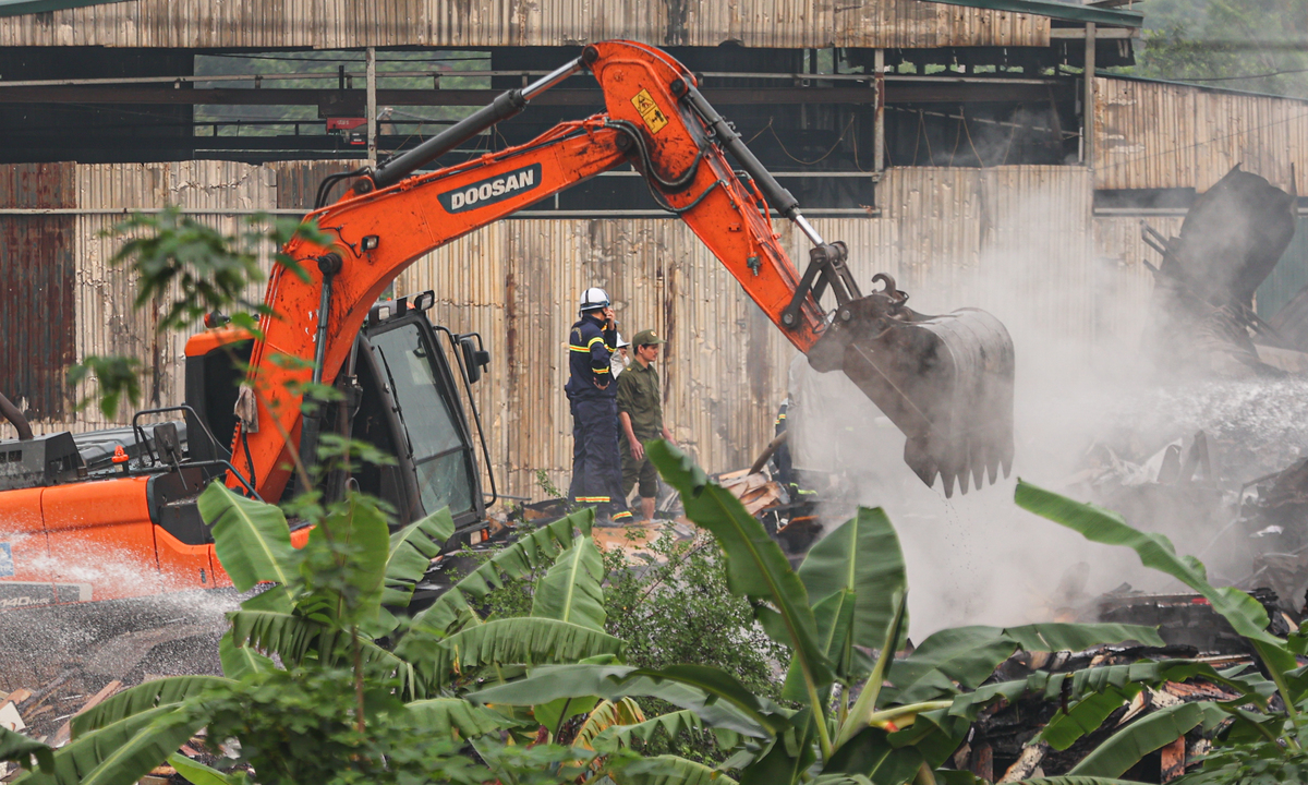 Tại hiện trường, nhiều mũi chữa cháy được triển khai đồng thời từ các hướng. Ngoài việc phun nước trực tiếp, lực lượng chức năng sử dụng máy xúc để phá dỡ lớp tôn bao quanh nhà xưởng, tạo lối tiếp cận vào sâu bên trong, nơi vẫn còn nhiều điểm cháy âm ỉ.