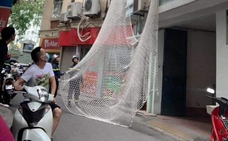 Tại hiện trường, lực lượng chức năng bao vây, phong tỏa ngôi nhà trên, đồng thời huy động xe thang, giăng lưới bên dưới ngôi nhà.