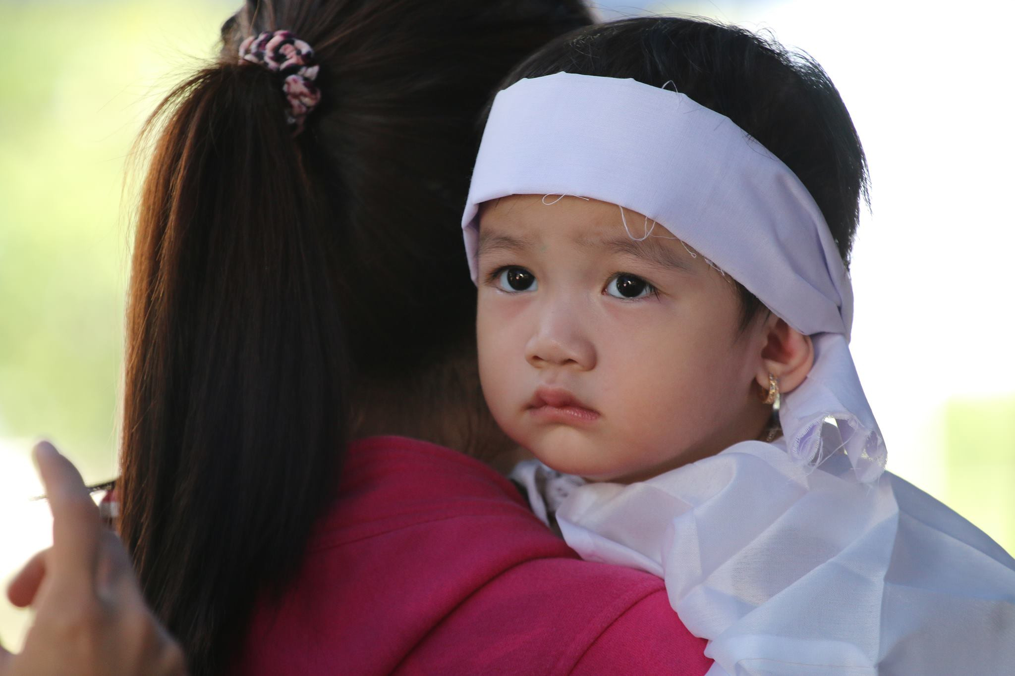 Con gái thứ 2 của anh Minh hướng ánh mắt đượm buồn tìm bố.