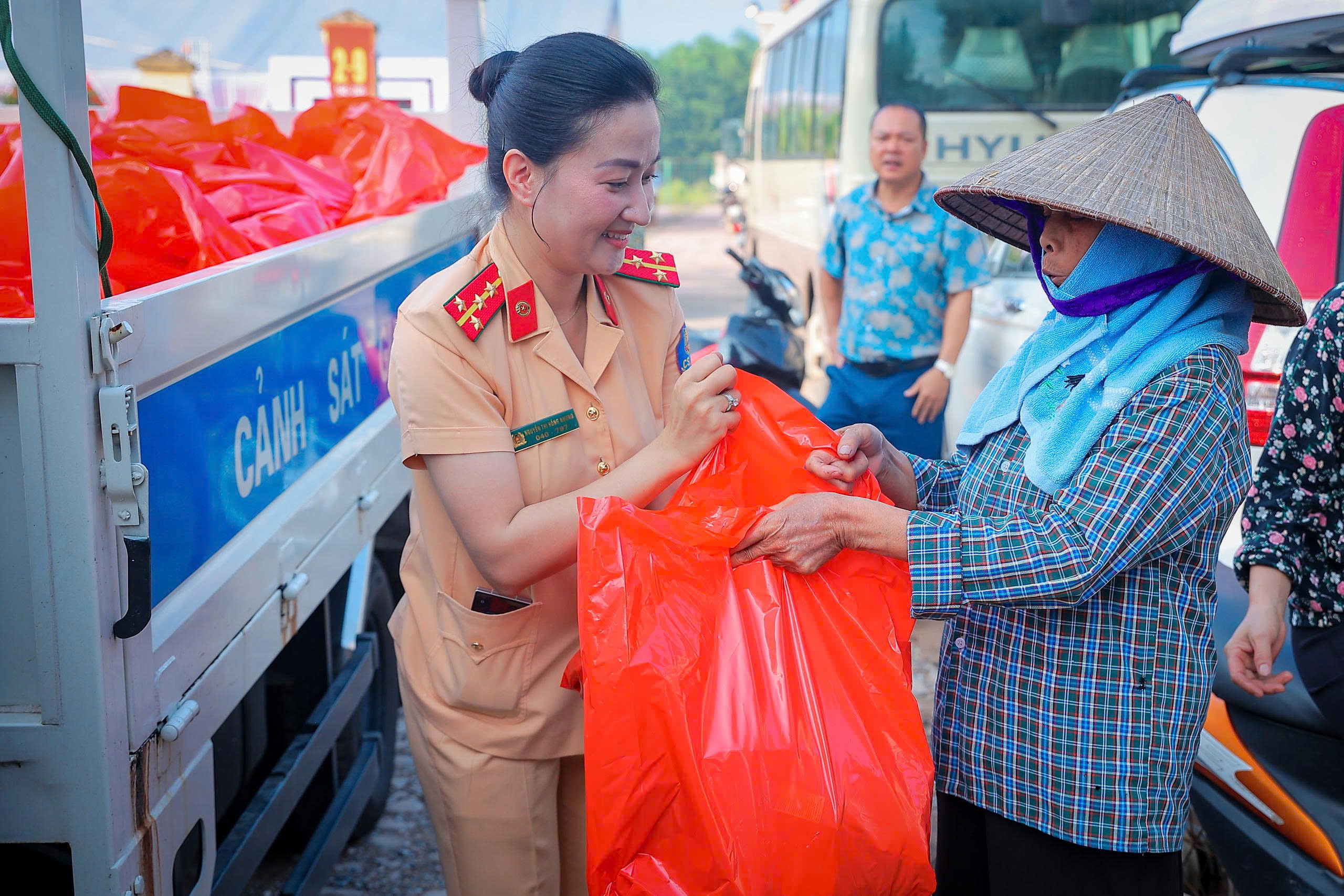 Đại úy Nguyễn Thị Hồng Nhung, Chủ tịch Hội Phụ nữ Phòng CSGT Hà Nội cho biết: “Ngoài cứu trợ khẩn cấp, điều người dân cần nhất là sự sẻ chia, đồng hành. Chúng tôi đã vận động hội viên quyên góp, phân loại, đóng gói vật dụng, thuốc men, trao tận tay người dân vùng ngập”.