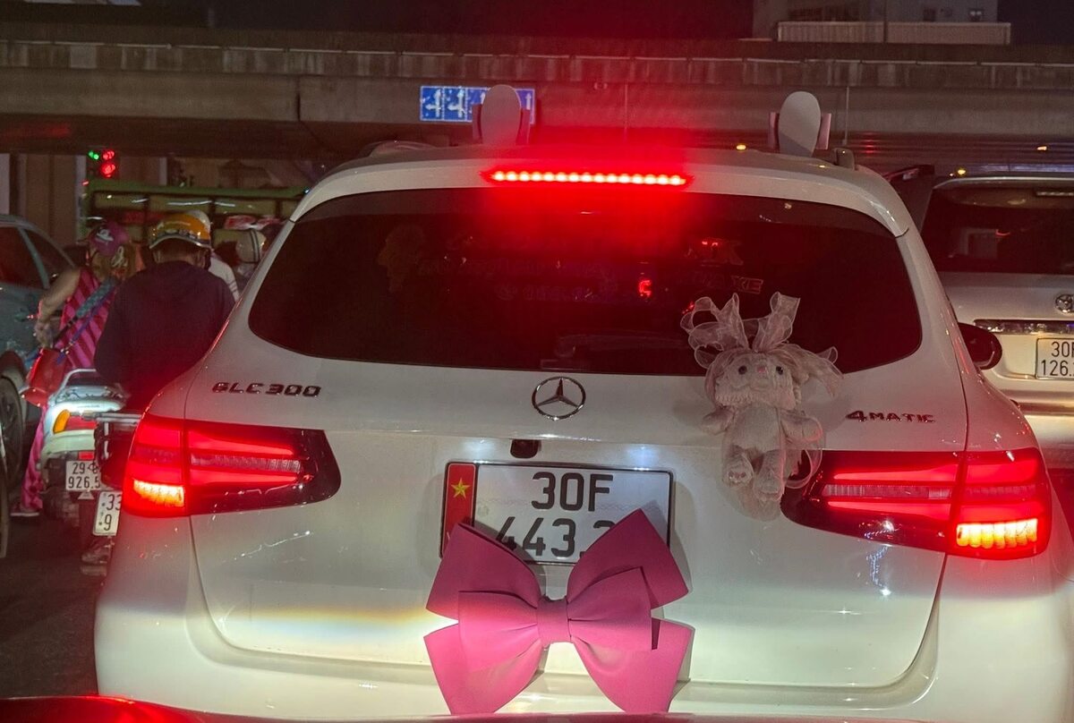 Trước đó, mạng xã hội chia sẻ đoạn clip ghi lại hình ảnh chiếc ô tô màu trắng hiệu Mercedes GLC 300 mang BKS 30F-443.xx lưu thông trên đường phố Hà Nội. Đáng chú ý, phía đuôi xe được gắn chiếc nơ hồng kích thước lớn, che mất 2 số cuổi của biển số.
