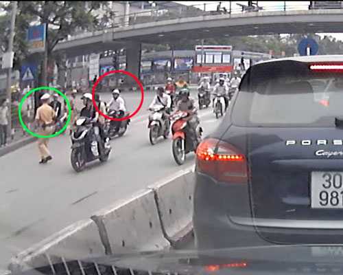 | Phát hiện người vi phạm, người cảnh sát bước ra giữa đường chỉ tín hiệu dừng xe. |