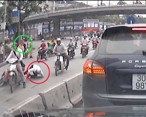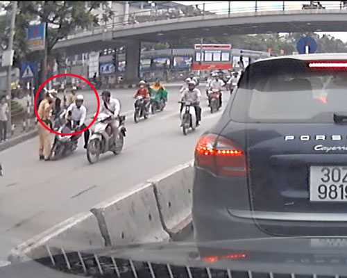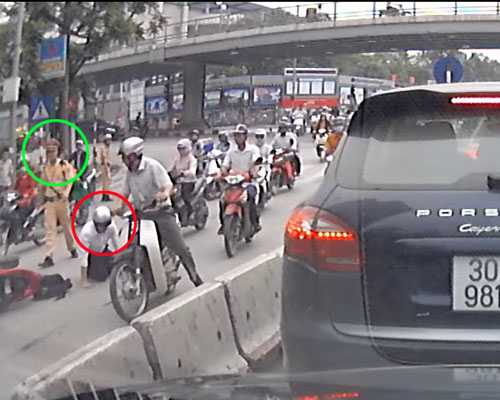 | Viên cảnh sát bước đến dựng xe cho người thanh niên và đẩy vào lề đường. |
