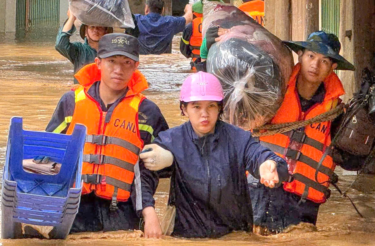 Lực lượng công an hỗ trợ một người dân ra khỏi vùng nguy hiểm.