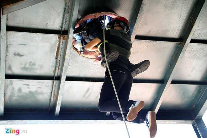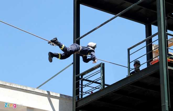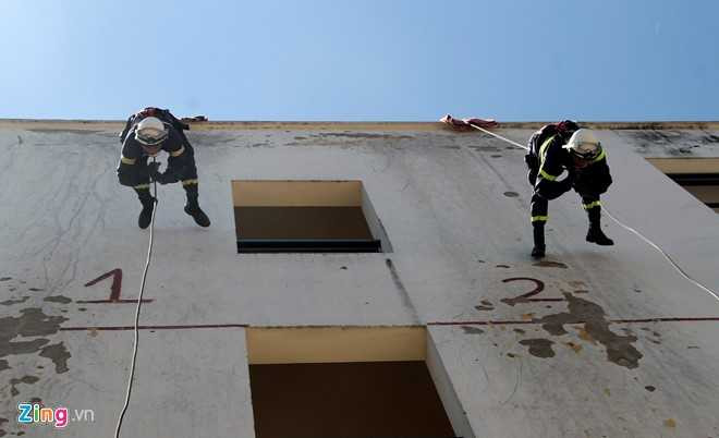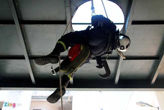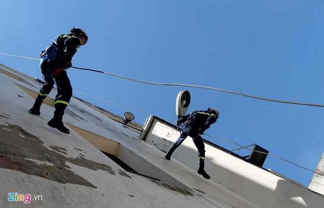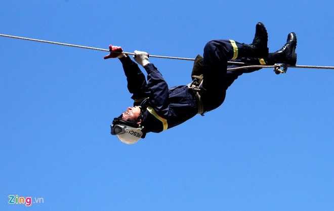 Trong những ngày nắng nóng, cấp trên thường nhắc nhở cán bộ tập luyện sớm để tránh ảnh hưởng sức khỏe. Buổi tập sáng của các anh thường bắt đầu từ 8h và kết thúc trước 10h30, ca chiều từ 15h30. Trong ảnh là bài tập leo dây tiếp cận cứu người từ độ cao hàng chục mét.