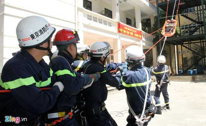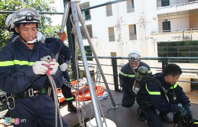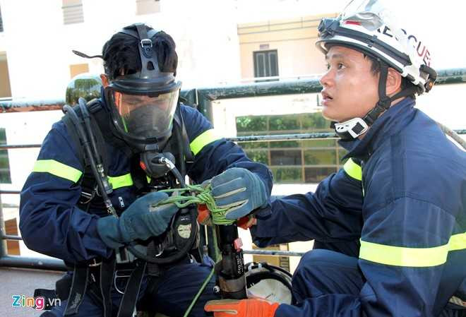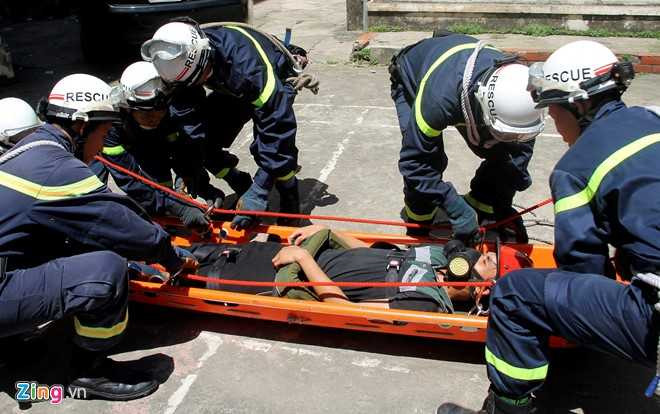 Đội hình sử dụng ròng rọc cứu người bị nạn trong kiện có khí độc.