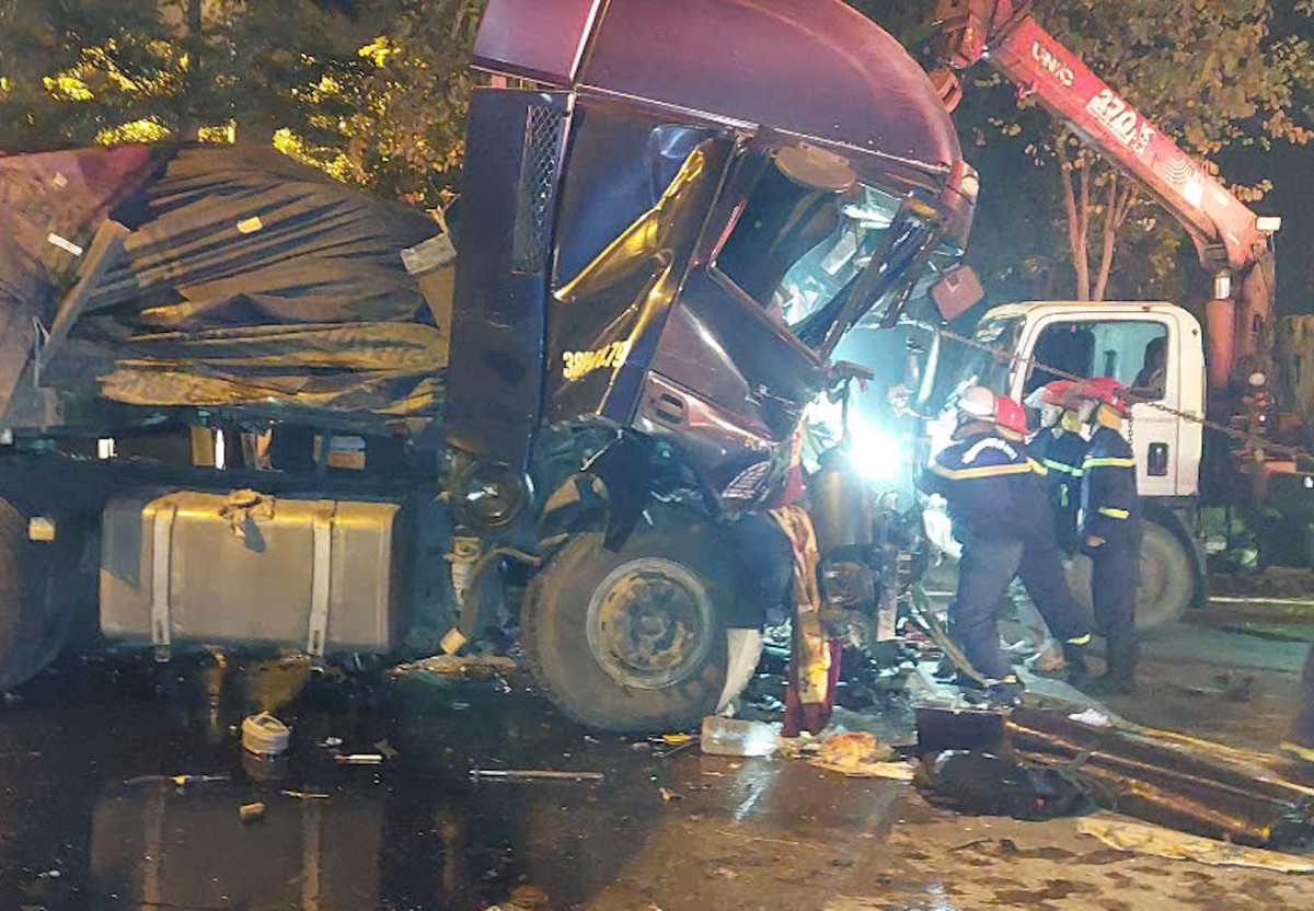 Công an huyện Mê Linh đang điều tra nguyên nhân vụ tai nạn giữa 2 xe đầu kéo khiến tài xế mắc kẹt trong cabin.